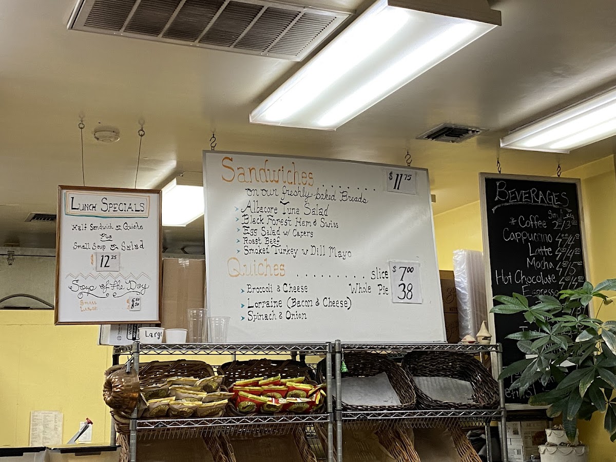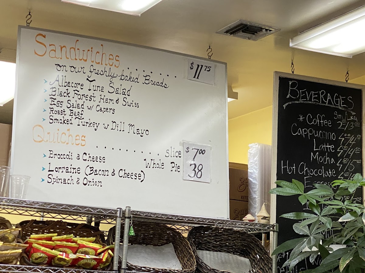 The menu offers a variety of bakery items alongside a selection of sandwiches, quiches, and beverages. Sandwich options include Albacore Tuna Salad, Black Forest Ham & Swiss, and Roast Beef. Quiches are available in a Spinach & Onion variety. The beverage selection features hot and cold drinks such as Coffee, Cappuccino, Latte, Mocha, Hot Chocolate, Espresso, Tea, Iced Tea, Iced Coffee, Milk, Water, and Soda.